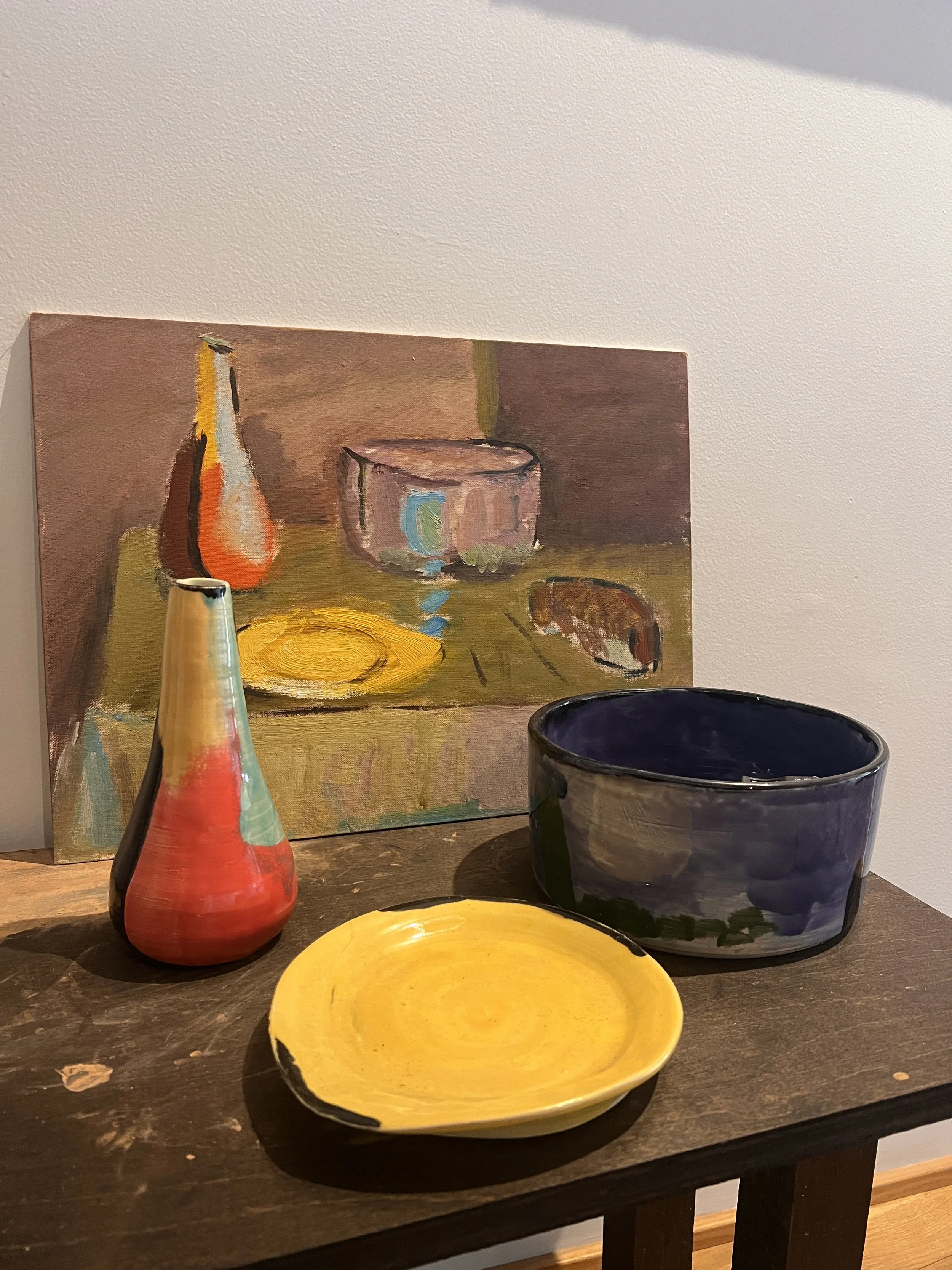 Dinner is a reverse still life, pieces are sculpted from a found painting. Artists often draw from objects, here the objects are created from the painting.